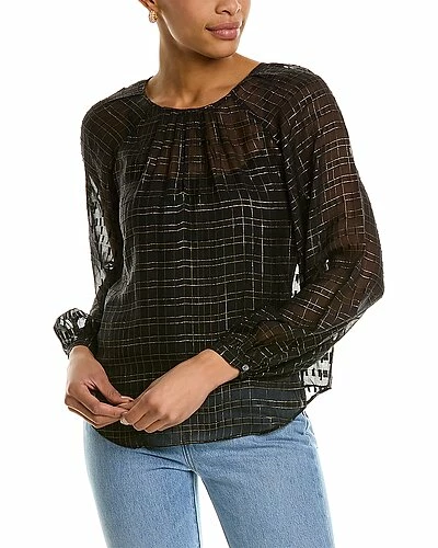 - Adison Silk-Blend Top in caviar with sheer metallic plaid design, shirred neckline, blouson sleeves, and ribbed trim