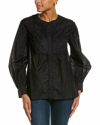 - Alfont Silk-Blend Blouse in caviar with waxed cord embroidery, mock collar, and button cuffs