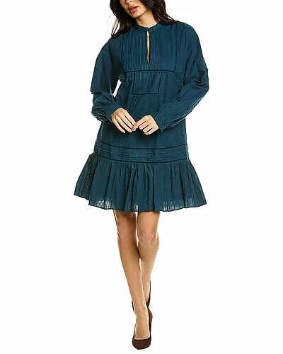 - Freira Dress in dark teal with pleated front, mandarin collar, sheer ladderstitch trim, button cuffs, and ruffle hem