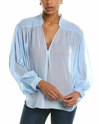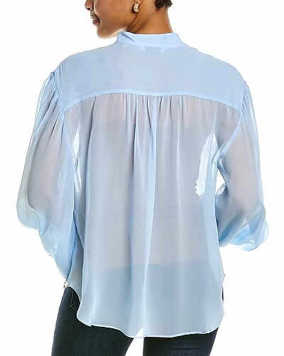 - Lasha Silk Top in powder blue with mock collar, V-neck, pleated front, shirred detailing, blouson sleeves, and button cuffs