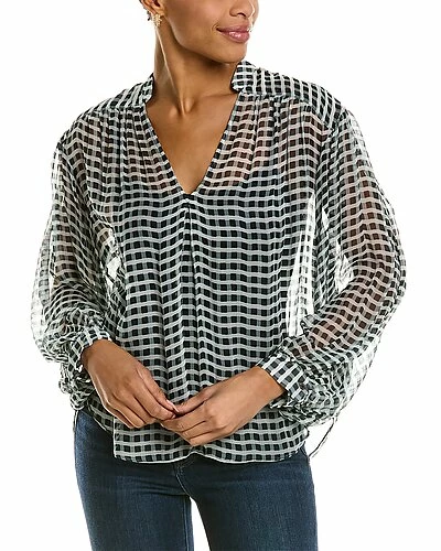 - Lasha Silk Top in black and white gingham with tunic style and blouson sleeves