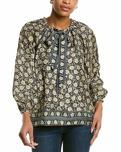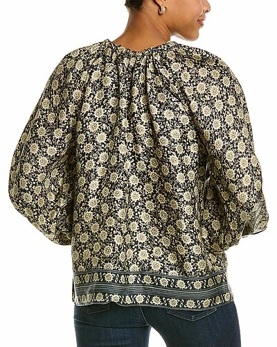 - Lomande Silk Blouse in caviar multicolor with drawcord neckline, blouson sleeves, and button cuffs